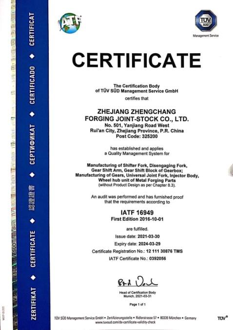 公司已获得TUV公司质量体系:IATF 16949 ISO 9001,环境管理体系:ISO 14001,职业健康安全管理体系:ISO 45001,测量管理体系:ISO 10012《测量管理体系-测量过程和测量设备的要求》标准的要求,被评定为省级技术研发中心,浙江省高新技术企业,并拥有自营进出口权。